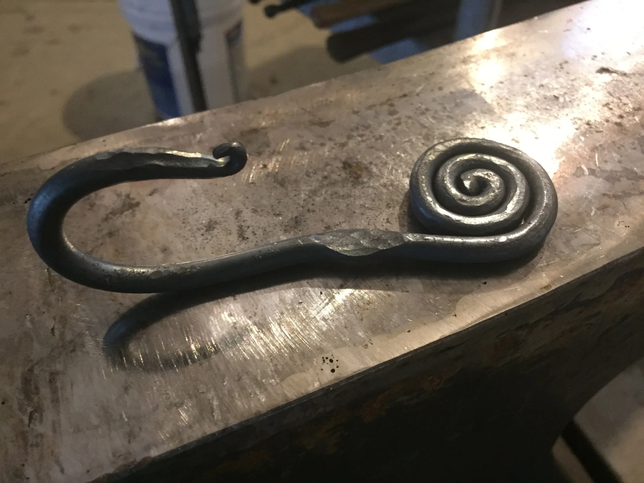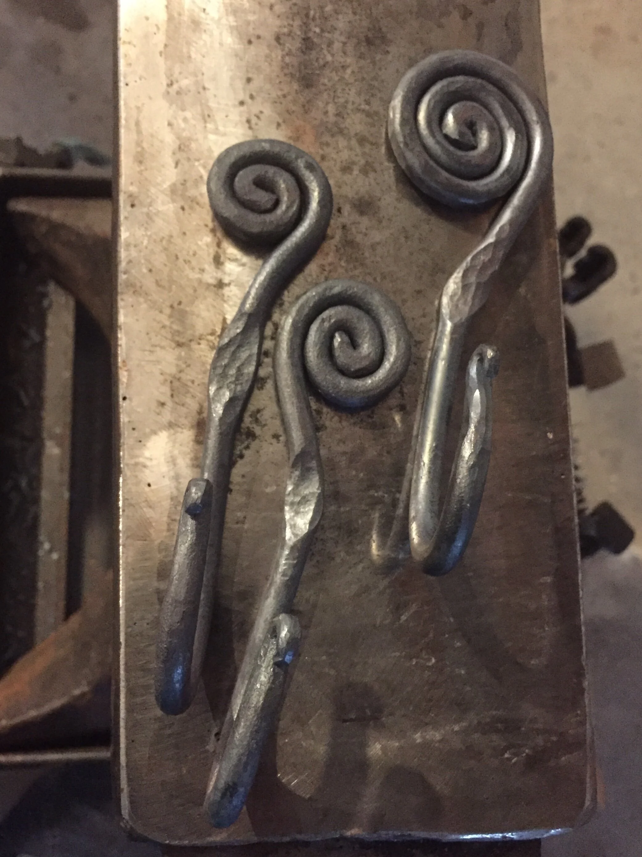 My sister Becky showed me a picture and asked me to make her some hooks like this. These are not replicas of the picture, but are my version of the hooks she wanted. I liked the way they turned out. They are different sizes because I wasn’t sure how long the piece of round stock should be when I started, so it took some experimentation to get the size I wanted. These hooks are finished except for the screw holes, which I added after taking the photos.
